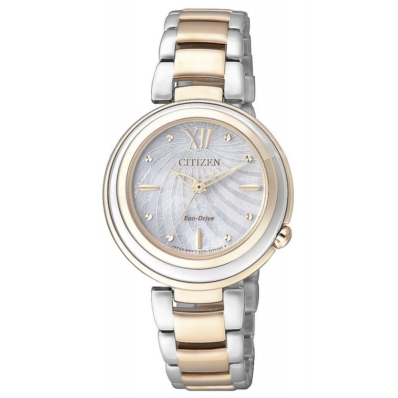 Citizen Damenuhr Elegant Eco-Drive EM0335-51D. Ausstattung / Details: Eco-Drive Antrieb; 180 Tage Gangreserve; Edelstahlgehäuse; Massives Edelstahlarmband; Sicherheitschließe; Perlmuttzifferblatt; Saphirglas; WR 5 bar; Höhe: 7 mm; Durchmesser: 30 mm; Gewicht: 62 g.| Uhr Informationen | |