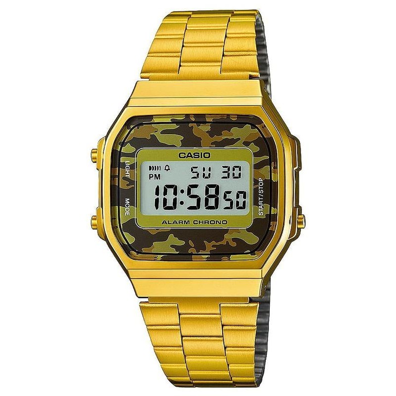 Marca: Casio; Colección: Casio Vintage; Código del Artículo: A168WEGC-5EF; Tipo de producto: Reloj; Género: Unisex; Funciones -> Multifunción: Cronógrafo, Alarma, Calendario Perpetuo, Fecha; Tipo de Movimiento / Mecanismo: Cuarzo / Bateria; Forma de la Caja: Rectangular; Material de la Caja: Plástico / Resina; Color de la Caja: Oro; Diámetro de la Caja Ø: 36,3 mm x 38,6 mm; Tipo de Esfera: Digital; Color de la Esfera: Camuflaje; Material de la Correa: Acero Inoxidable; Color de la Correa: Oro.